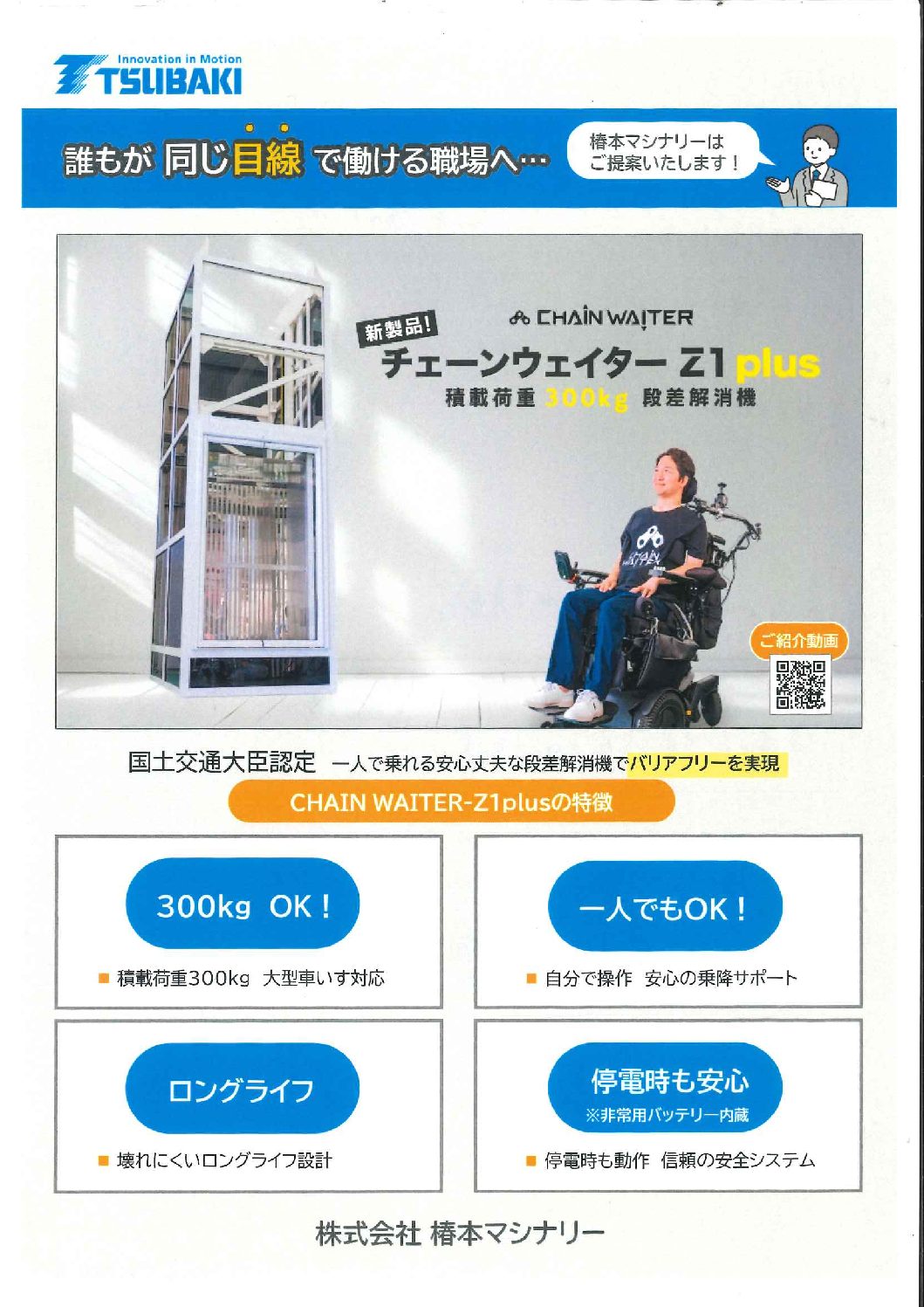 CHAIN WAITER Z1 plusは、車いす利用者のための“鉛直型段差解消機”であり、住宅・施設・公共建築などでのバリアフリー対策として設置を想定された最新モデルです。